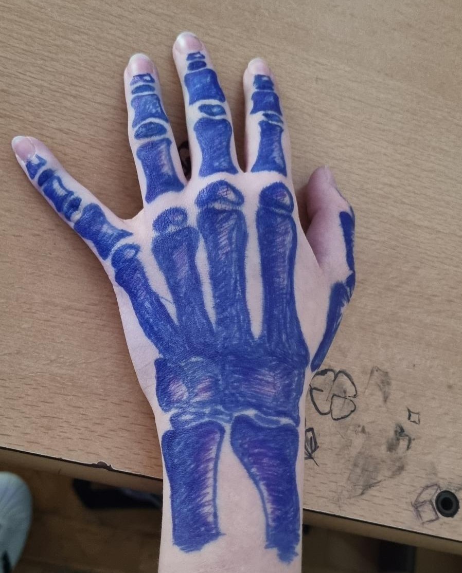 Hier war mir im Ethikunterricht so langweilig, dass ich meiner Kollegin eine Skelethand aufgemalt habe und noch vor Stundenschluss fertig war.
